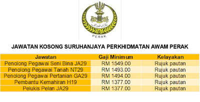 Suruhanjaya Perkhidmatan Awam Negeri Perak telah membuka beberapa jawatan kosong kepada seluruh rakyat Negeri Perak yang berkelayakan. Di ba...