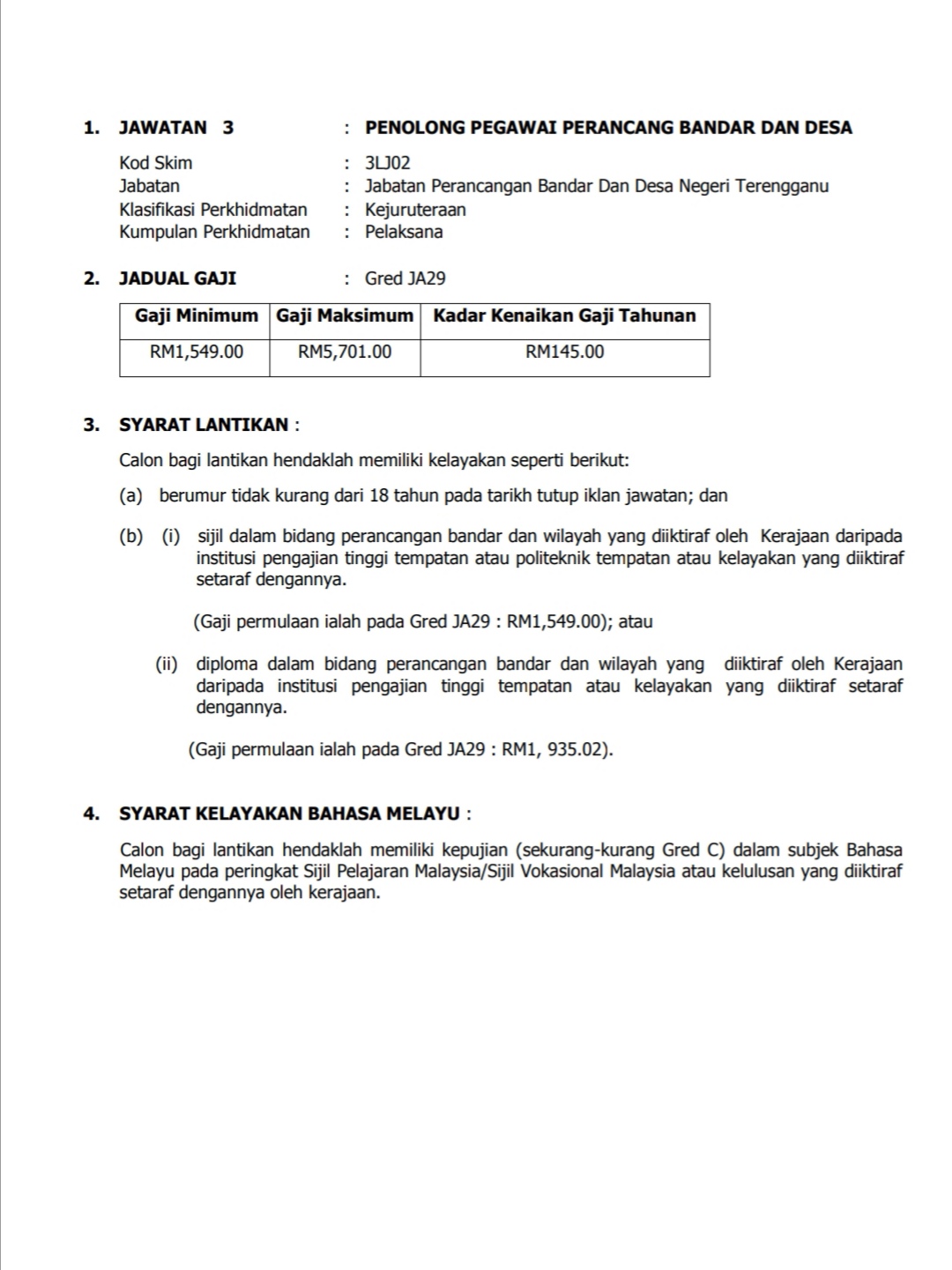 - Penolong Pegawai Perancang Bandar dan Desa Gred JA29