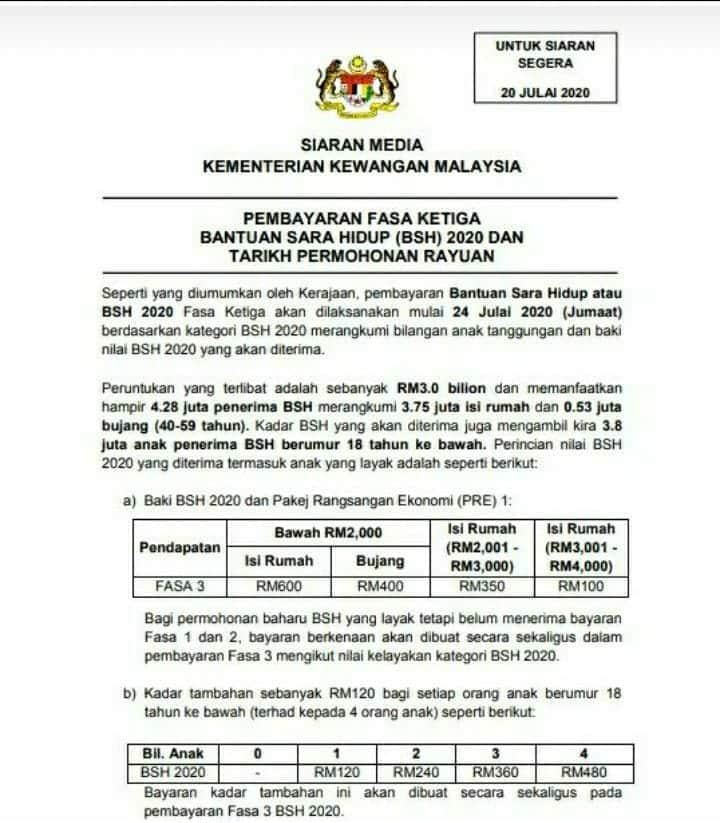 MAKLUMAT PEMBAYARAN BSH FASA 3 AMAUN TAMBAHAN RASMI Daripada kenyataan rasmi oleh Menteri Kewangan pada 30 Jun, beliau ...