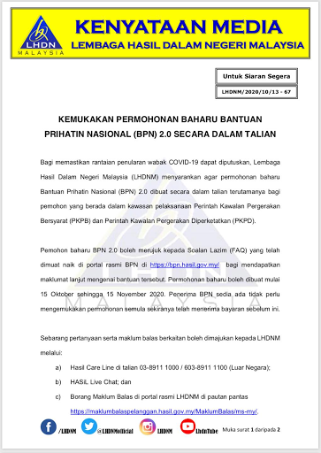 Kini, LHDNM menyarankan permohonan baharu BPN 2.0 dibuat secara atas talian. Hal ini kerana peningkatan semula wabak COVID-19 di negara yang telah memasuki gelombang ketiga.