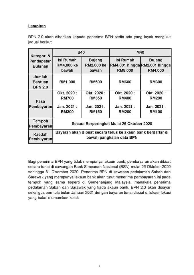 - Manakala, penerima pedalaman Sabah dan Sarawak yang tiada akaun bank, BPN 2.0 akan dibayar sekaligus bermula Januari 2021 dengan bayaran tunai yang bakal diumumkan kelak