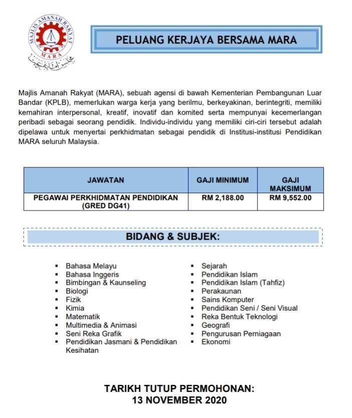 INFO JAWATAN KOSONG BIDANG PENDIDIKAN MARA 2020