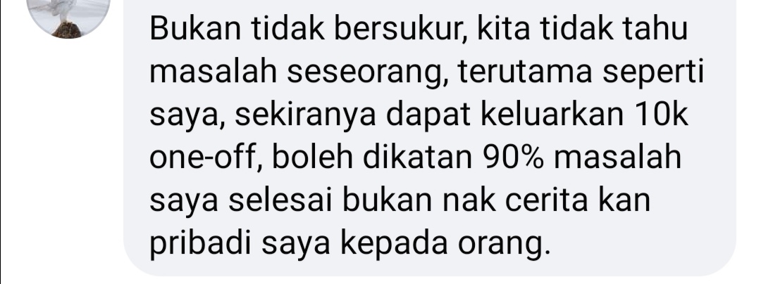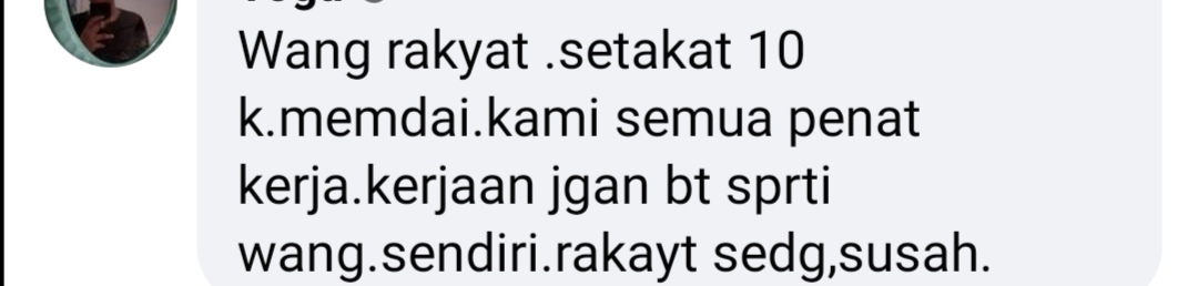 Rakyat begitu sedih, mungkin sekiranya pengeluran RM 10,000 dibenarkan, kami telah mampu membayar hutang, membeli barang keperluan yang mampu membuat ahli keluarga kami tersenyum. Hal ini kerana, kami bukan semua lahir daripada golongan orang kaya. Ada diantara kami hanya kais pagi makan pagi.