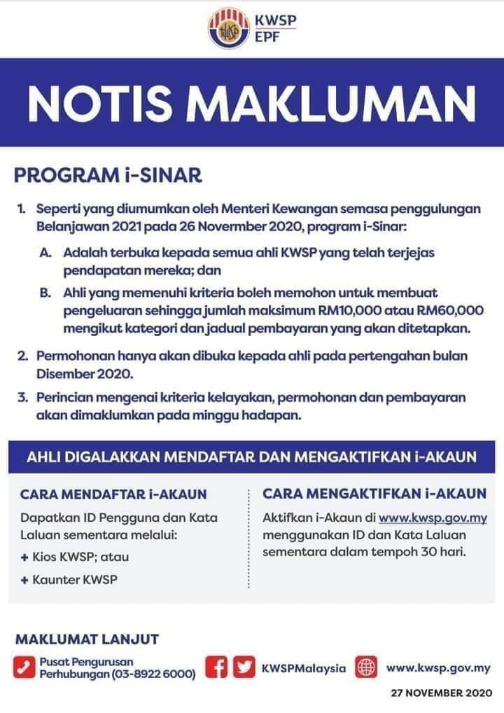 KWSP telah mengeluarkan sebuah notis rasmi berkaitan maklumat rasmi berkaitan i-Sinar. Sila baca maklumat di bawah. PROGRAM i-SIN...