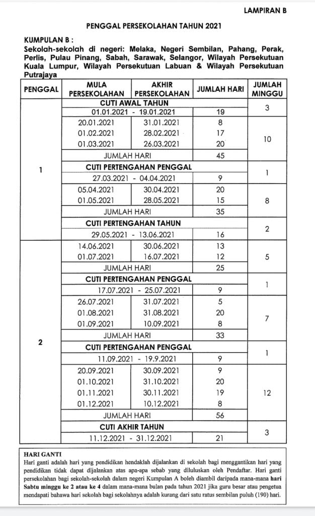 Bagi sekolah-sekolah dalam negeri Kumpulan B, penggal persekolahan akan bermula pada 20 Januari dan tamat pada 10 Disember 2021.