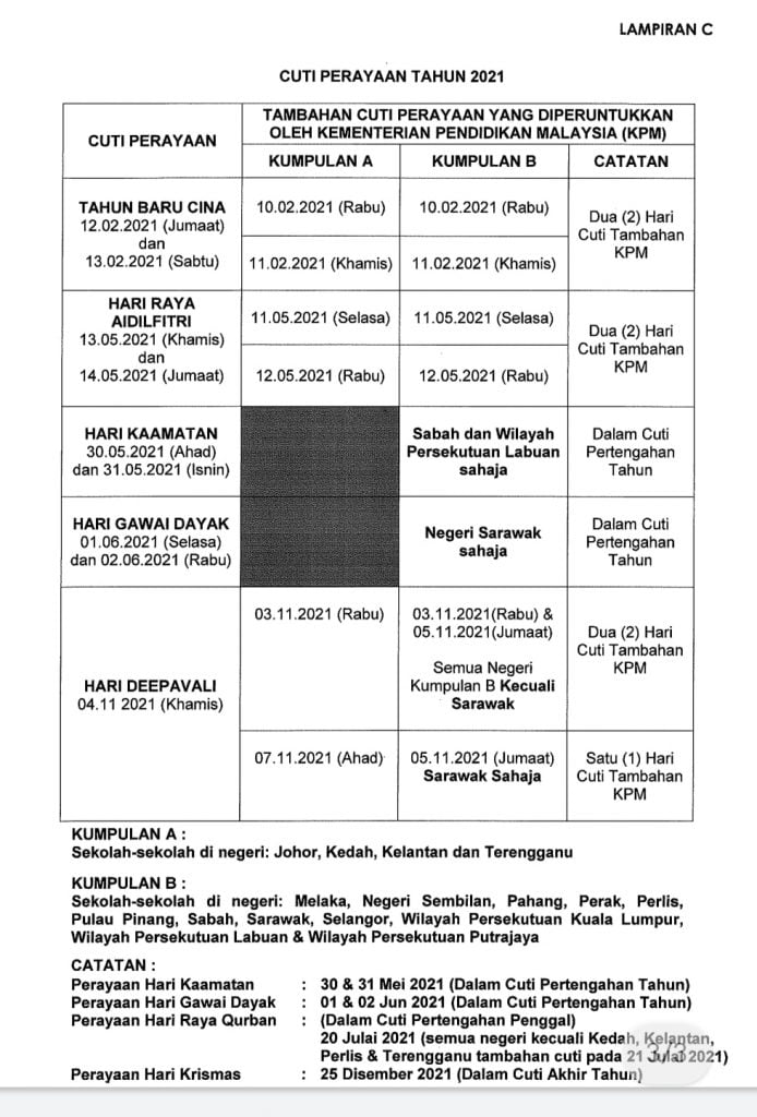 Semoga perincian cuti sekolah dan tarikh perayaan yang dikeluarkan oleh KPM dapat membantu ibu bapa, guru serta pelajar merancang aktiviti pada tahun 2021.