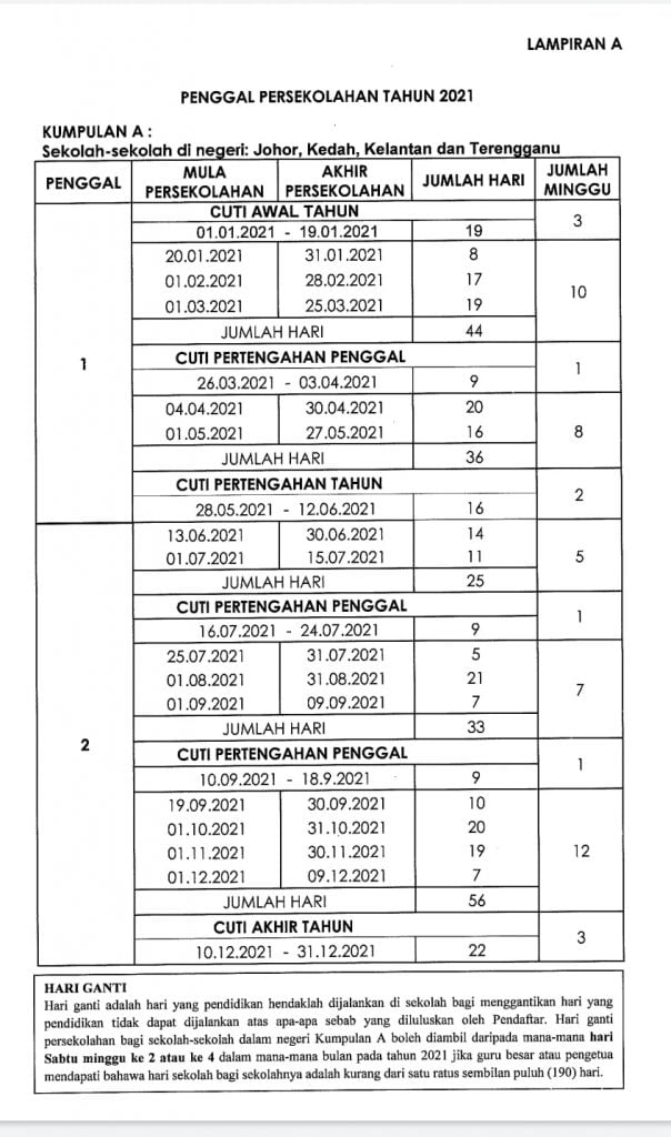 Untuk makluman para pembaca, penggal persekolahan bagi sesi tahun 2021 Kumpulan A bakal bermula pada 20 Januari dan akan tamat pada 9 Disember 2021.