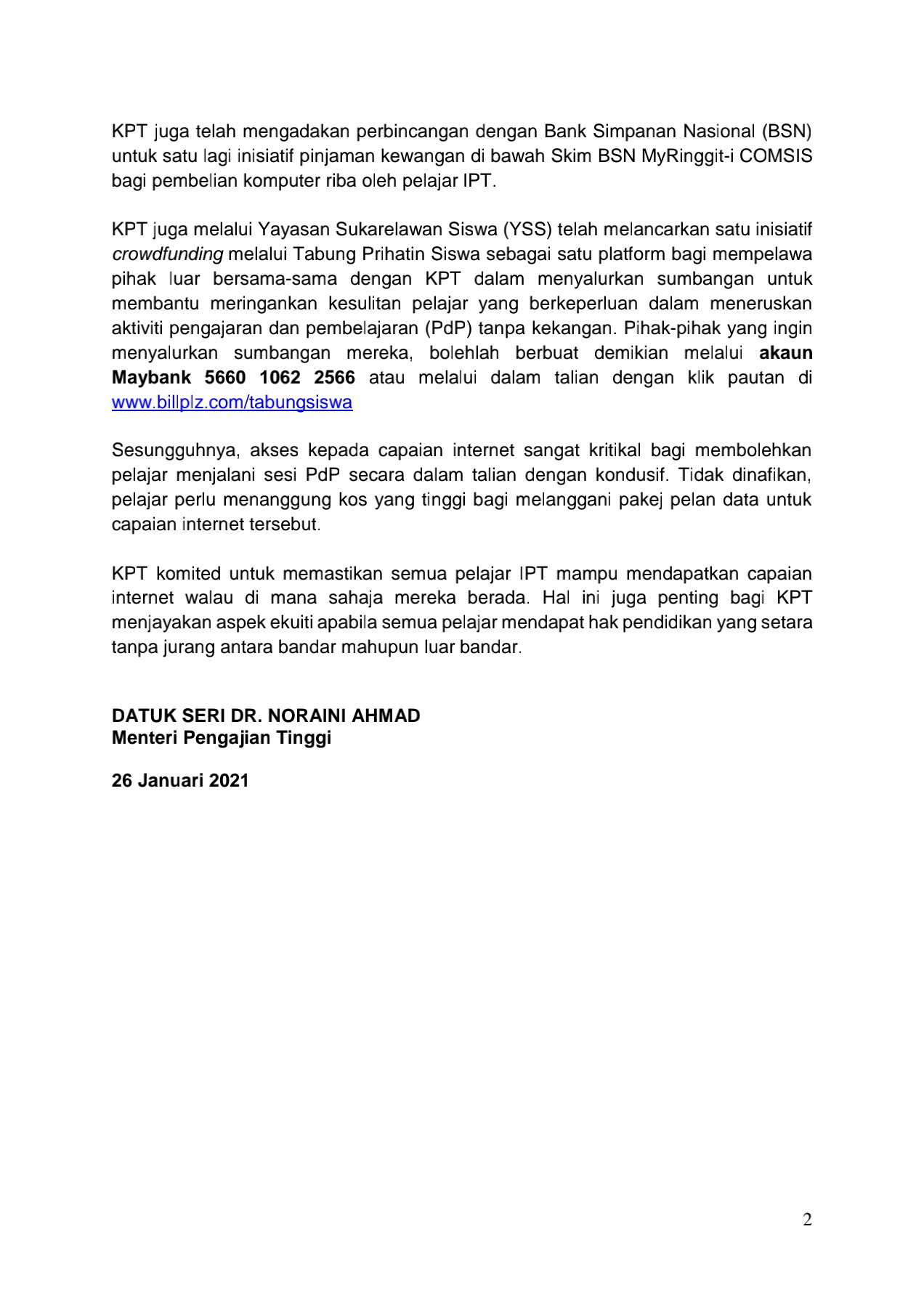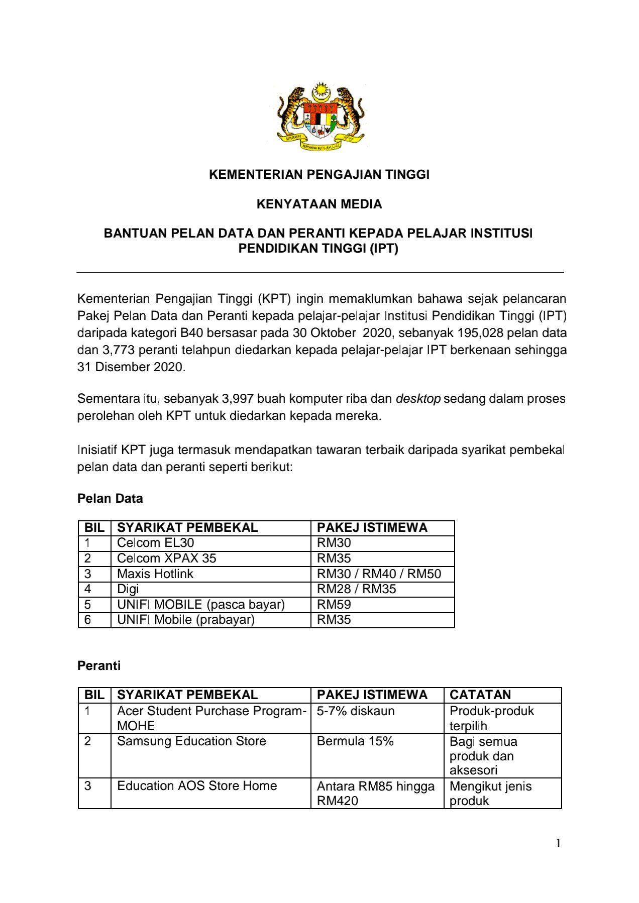 Menerusi kenyataan media daripada Menteri Pengajian Tinggi, Datuk Seri Dr Noraini hari ini berkata inisiatif KPT juga termasuklah mendapatkan tawaran terbaik daripada syarikat pembekal terkemuka seperti Celcom, Digi, Maxis dan Acer.