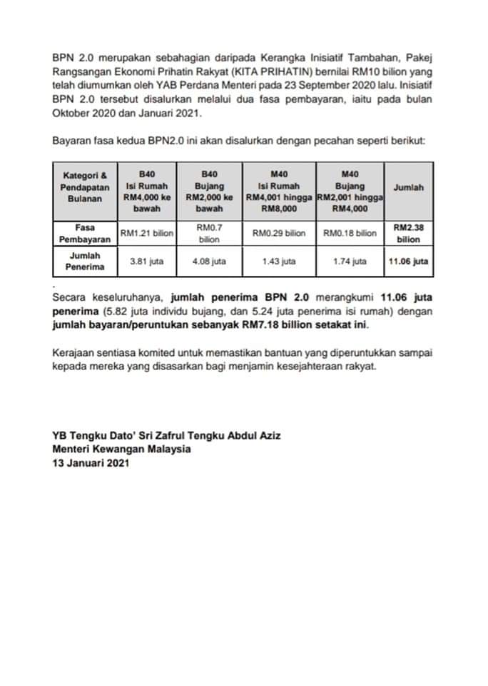 Sukacita untuk dimaklumkan bahawa pembayaran BPN 2.0 fasa 2 dan penerima baharu akan dipercepatkan mulai 21 Januari (Khamis).