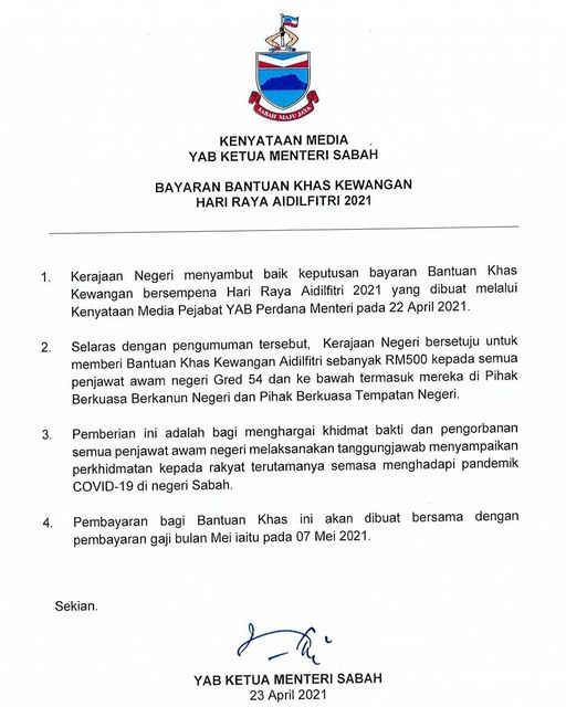 Oleh itu, kerajaan negeri Sabah telah bersetuju untuk turut memberikan Bantuan Khas Aidilfitri kepada yang layak.