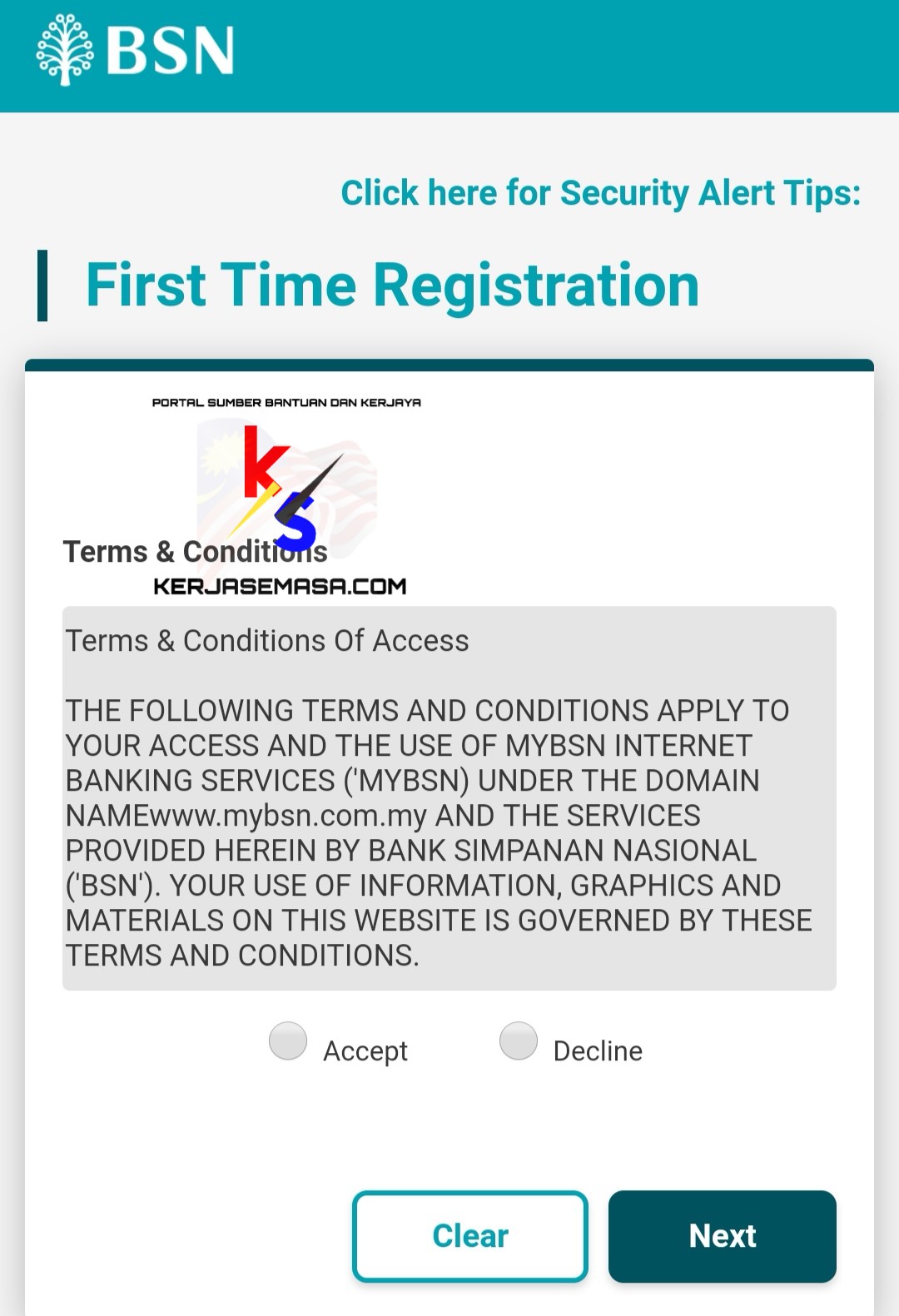 3. Baca kesemua terma dan syarat yang telah ditetapkan oleh BSN. Untuk menggunakan perkhimatan MyBSN, anda perlu tandakan pada ruangan 'setuju' atau accept.