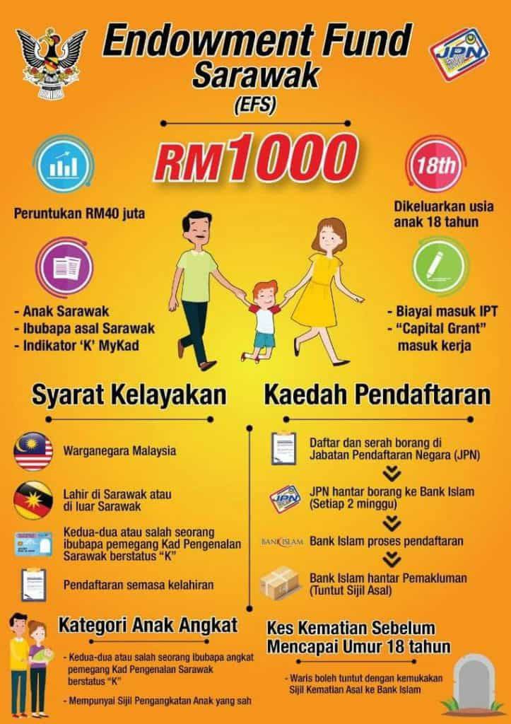 Kerajaan Negeri Sarawak melalui Kementerian Pembangunan Wanita, Kanak-Kanak dan Kesejahteraan Komuniti telah mewujudkan satu bantuan kewangan RM 1,000 untuk anak sehingga berumur 18 tahun dikenali sebagai Endowment Fund Sarawak (EFS).