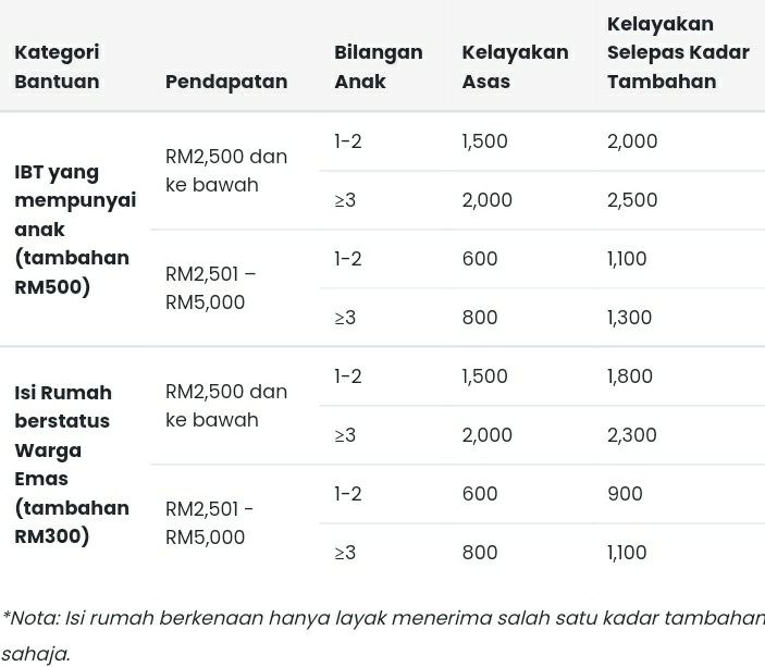- Bantuan tambahan RM 500 diberikan kepada kategori Ibu Bapa Tunggal (IBT) yang mempunyai anak yang memenuhi syarat dan