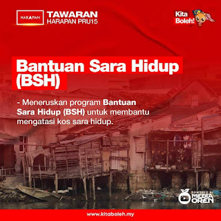 - meneruskan program Bantuan Sara Hidup (BSH) untuk membantu mengatasi kos sara hidup
