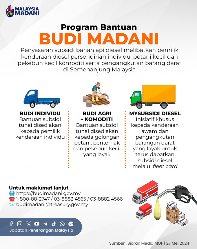Segala maklumat yang telah dikongsikan di atas adalah merujuk kepada sumber rasmi daripada Portal Rasmi BUDI MADANI. Untuk sebarang persoalan, penjelasan lanjut, atau jika anda memerlukan bantuan lebih lanjut mengenai program atau inisiatif yang telah disebutkan, anda boleh terus menghubungi pihak berwajib yang berkenaan melalui saluran yang disediakan di bawah ini.
