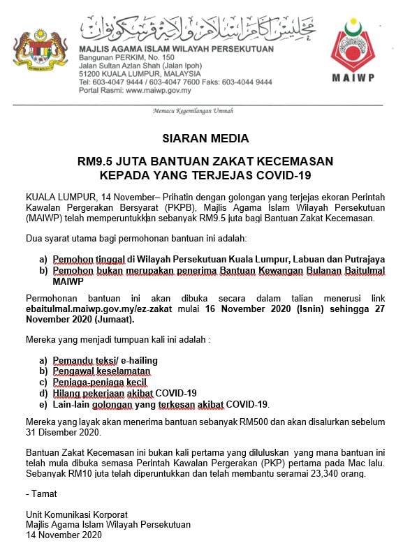 Permohonan Bantuan Zakat Kecemasan MAIWP akan dibuka bermula 16 November (Isnin) sehingga 27 November.