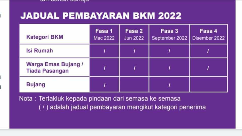 Mengikut daripada gambaran jadual yang diberikan, pembayaran Bantuan Keluarga Malaysia (BKM) akan dibayar dalam 4 fasa.