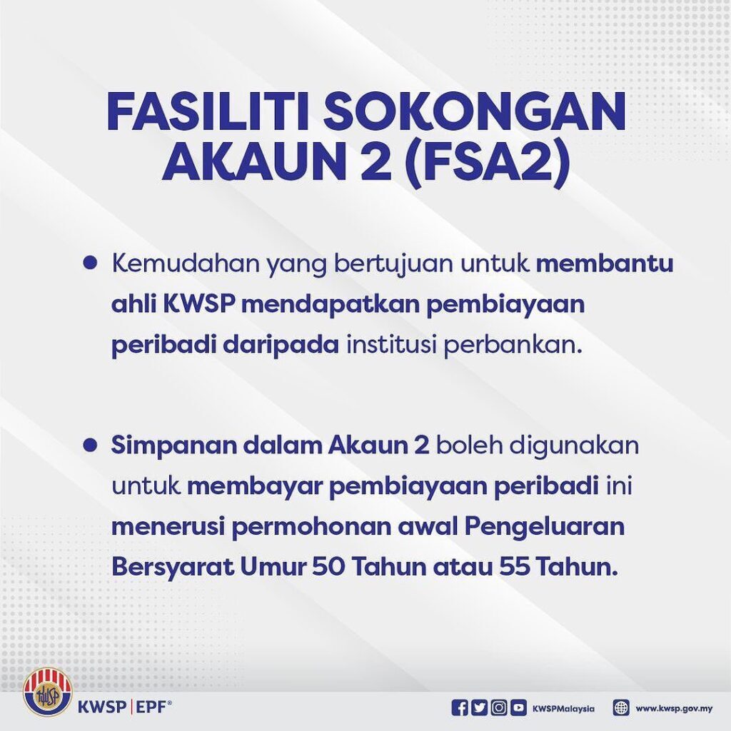 Berita baik kepada pencarum KWSP, Pengeluaran KWSP yang dikenali sebagai Fasiliti Sokongan Akaun 2 (FSA2) dilancarkan tetapi secara bersyarat iaitu dalam bentuk pembiayaan.